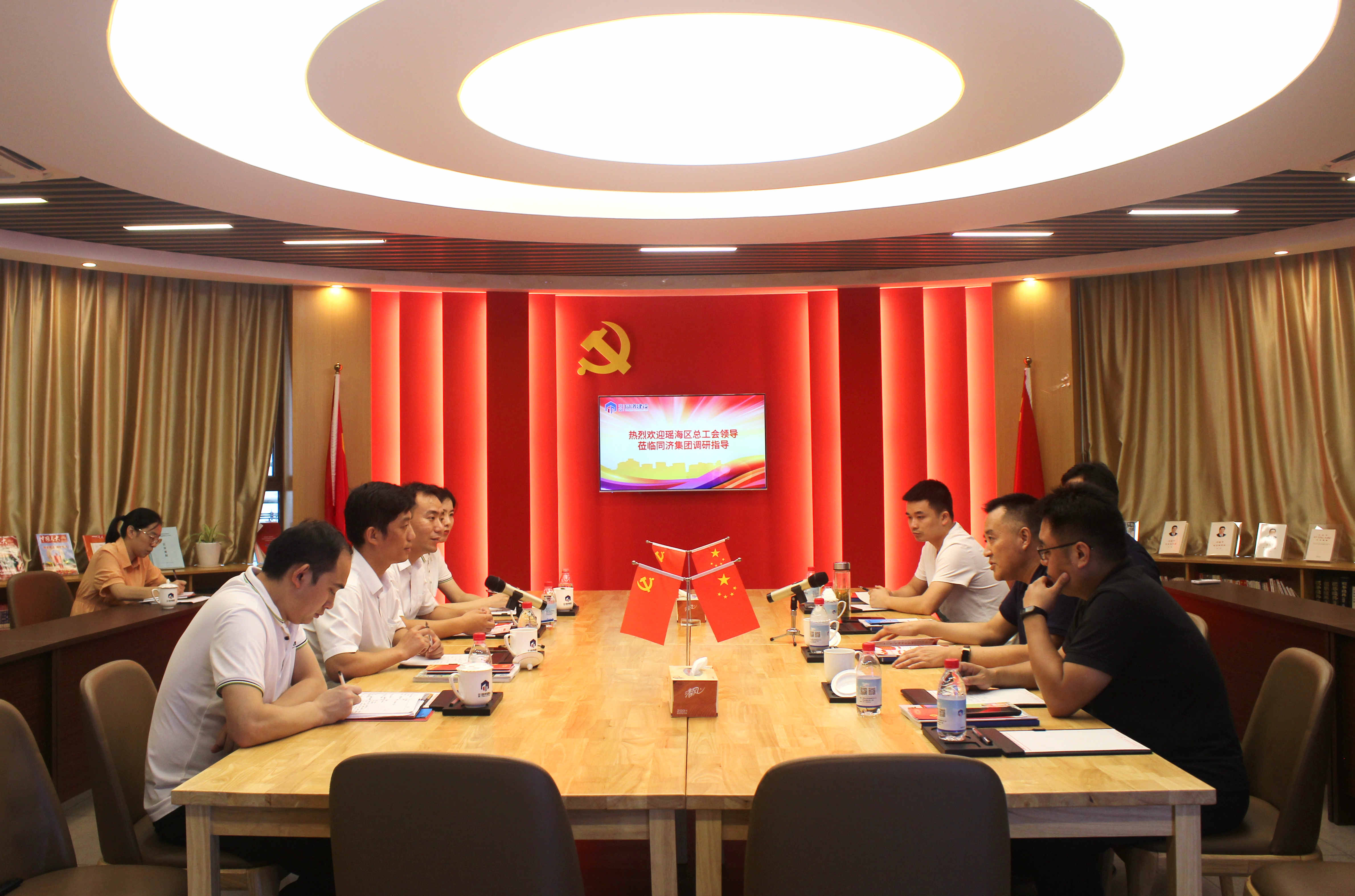 7月21日下午,瑤海區總工會黨組書記、副主席張勇一行到同濟集團調研指導工會工作,瑤海區總工會副主席江富貴、方廟街道黨工委副書記蘇鳴等陪同調研,同濟集團黨委副書記、工會主席劉長豐,同濟集團人力資源副總監、安徽旭東一家公司總經理趙小寶等熱情接待。