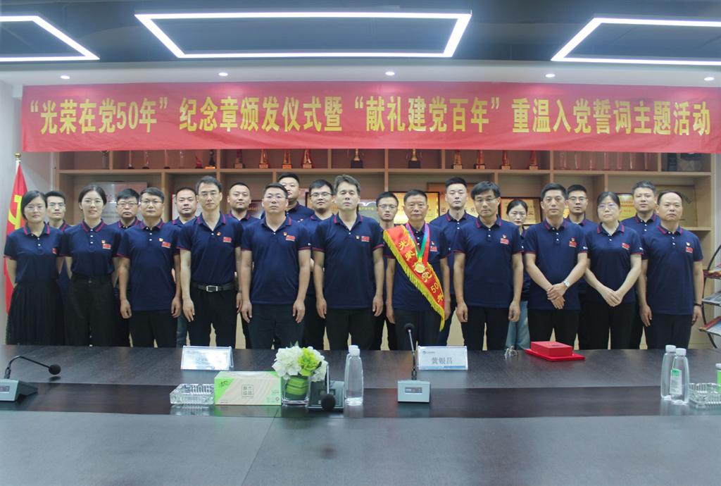 黨委書記、董事長吳曉東為黃銀昌頒發(fā)“光榮在黨50年”紀念章