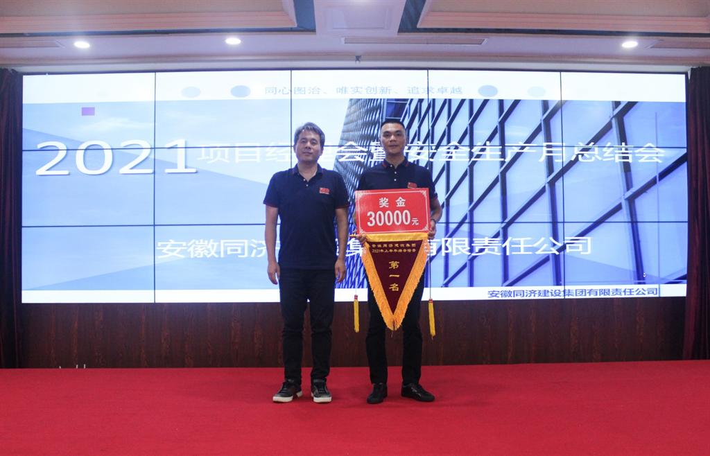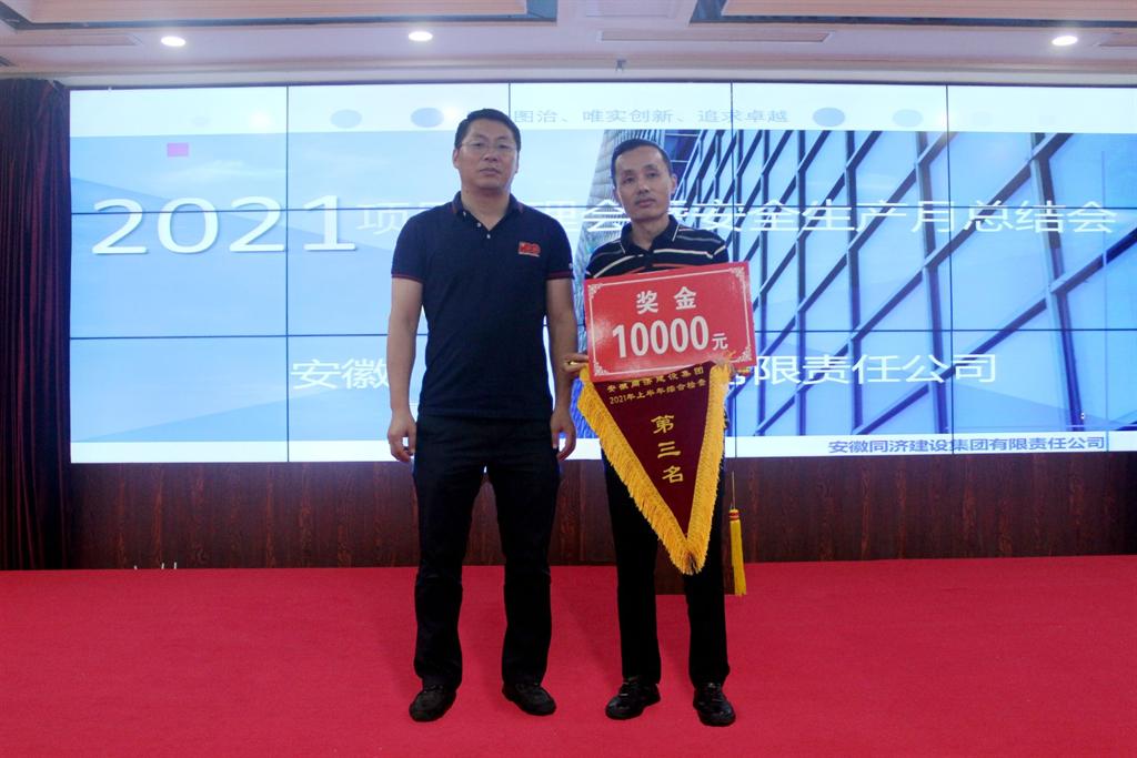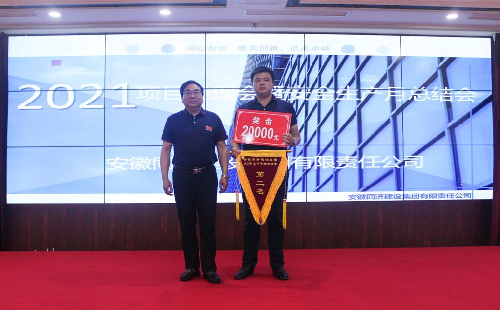 黨委副書記、董事、總經(jīng)理高先志為第三名頒獎(jiǎng)阜陽新城紅郡項(xiàng)目代表李正東領(lǐng)獎(jiǎng) 吳曉東指出,今年上半年,集團(tuán)經(jīng)營(yíng)風(fēng)險(xiǎn)控制得當(dāng),資產(chǎn)總量持續(xù)增長(zhǎng),以穩(wěn)中向好的態(tài)勢(shì)進(jìn)入“下半場(chǎng)”。這些成績(jī)的取得,離不開全體同濟(jì)人上下一心、左右齊一的付出。吳曉東提出幾點(diǎn)希望與要求:一是牢記安全生產(chǎn)理念。安全問題無小事,各項(xiàng)目部、單位要弘揚(yáng)“生命至上、安全第一”的思想,壓實(shí)安全責(zé)任,做到安全生產(chǎn)警鐘長(zhǎng)鳴;二是“嚴(yán)”字當(dāng)頭,強(qiáng)化事前風(fēng)險(xiǎn)管控。以合約規(guī)劃為抓手,加強(qiáng)項(xiàng)目安全、財(cái)務(wù)安全的事前控制,將風(fēng)險(xiǎn)消滅在萌芽狀態(tài);三是持續(xù)推進(jìn)管理機(jī)制規(guī)范化、專業(yè)化、標(biāo)準(zhǔn)化。要求各在建項(xiàng)目規(guī)范勞務(wù)用工,積極推進(jìn)工法、QC課題等技術(shù)成果在項(xiàng)目落地。 吳曉東表示,當(dāng)下國(guó)家高度重視民營(yíng)經(jīng)濟(jì)發(fā)展,建筑業(yè)正從傳統(tǒng)型、粗放式發(fā)展逐步邁向高質(zhì)量、高效益的精品建筑、智慧建筑時(shí)代。立足新起點(diǎn)的同濟(jì),將不忘初心,牢記使命,搶占合肥城市總體規(guī)劃新布局,搶抓安徽自貿(mào)試驗(yàn)區(qū)、國(guó)家級(jí)經(jīng)濟(jì)技術(shù)開發(fā)區(qū)發(fā)展新機(jī)遇,揚(yáng)帆十四五,形成“立足安徽,布局全國(guó),開拓國(guó)際”的市場(chǎng)格局。希望各工程項(xiàng)目部和全體同濟(jì)人強(qiáng)化主體責(zé)任意識(shí),規(guī)范項(xiàng)目管理,共同提升項(xiàng)目管理水平,以嶄新的姿態(tài)開啟同濟(jì)高質(zhì)量發(fā)展的新篇章!