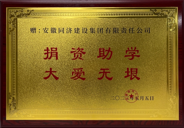 2023年5月5日,在安徽建筑大學(xué)65周年華誕之際,同濟(jì)集團(tuán)獲贈(zèng)該校“捐資助學(xué)、大愛無垠”牌匾。 |