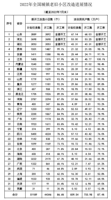 2022年《政府工作報告》提出,再開工改造一批城鎮老舊小區。經匯總各地統計上報數據,2022年全國計劃新開工改造城鎮老舊小區5.1萬個、840萬戶。