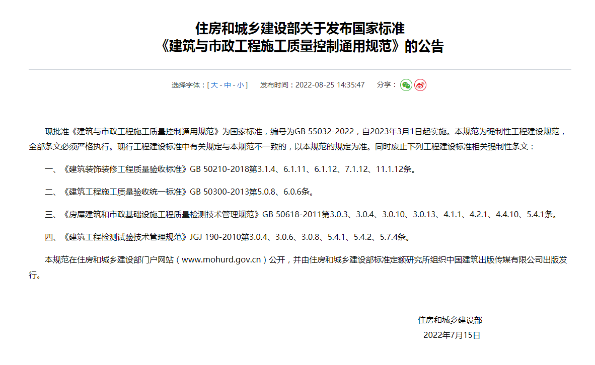 建設單位是工程質量第一責任人 !非建設單位委托的檢測機構出具的檢測報告不得作為工程質量驗收依據發布者:陳鎣喬 點擊數:2377 更新時間:2022/09/14 近日,住房和城鄉建設部公布了全文強制性國家標準《建筑與市政工程施工質量控制通用規范》GB 55032-2022,自2023年3月1日起實施。 其中第3.4.1條規定:建設單位應委托具備相應資質的第三方檢測機構進行工程質量檢測,檢測項目和數量應符合抽樣檢驗要求。非建設單位委托的檢測機構出具的檢測報告不得作為工程質量驗收依據。