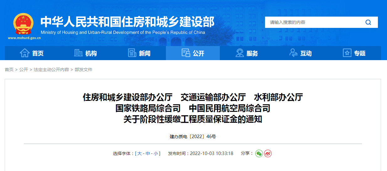 住建部等5部門:緩繳各類工程質量保證金!!建設單位不得以扣留工程款等方式收取發布者:陳鎣喬 點擊數:2038 更新時間:2022/10/12