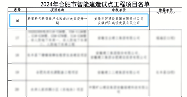 近日,合肥市城鄉建設局發布《關于公布2024年合肥市智能建造試點工程項目的通知》,由安徽同濟建設集團有限責任公司和安徽昕陽建設發展有限公司聯合體承建的科里科氣新智造產業園畝均效益提升一期工程被列為“合肥市2024年智能建造試點工程項目”。