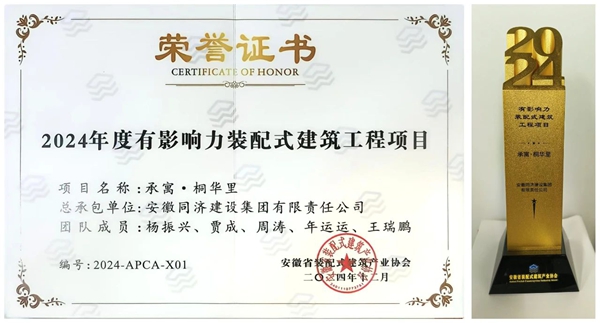 12月28日,安徽省裝配式建筑產業協會一屆一次會員大會(理事會)暨技術交流會在合肥隆重召開,會議表彰了2024年度在裝配式建筑領域取得優異成績的先進單位、項目及個人。同濟集團獲評“2024年度裝配式與智能建造技術創新單位”,承建的承寓·桐華里項目獲評“2024年度有影響力裝配式建筑工程項目”,承寓·桐華里項目經理楊振興獲評“2024年度裝配式建筑技術推廣先進個人”。
