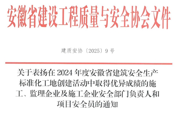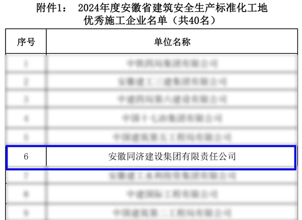 近日,安徽省建設工程質量與安全協會發布《關于表揚在2024年度安徽省建筑安全生產標準化工地創建活動中取得優異成績的施工、監理企業及施工企業安全部門負責人和項目安全員的通知》文件,同濟集團獲評“2024年度安徽省建筑安全生產標準化工地優秀施工企業”,安全總監汪海華獲評“2024年度安徽省建筑安全生產標準化工地優秀施工企業安全部門負責人”,40位項目安全員獲評“2024年度安徽省建筑安全生產標準化工地優秀項目安全員”。