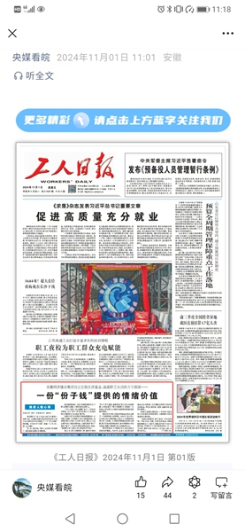 《央媒看皖》公眾號(hào) 2024年11月1日::工人日?qǐng)?bào)頭版丨一份“份子錢”提供的情緒價(jià)值