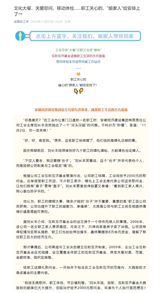 《全國(guó)總工會(huì)》公眾號(hào) 2024年11月1日:文化大餐、關(guān)愛慰問、移動(dòng)體檢……職工關(guān)心的,“娘家人”給安排上了→