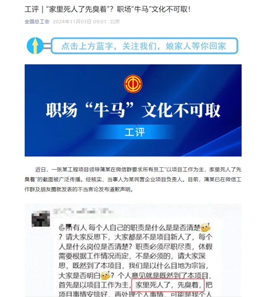 《全國(guó)總工會(huì)》公眾號(hào) 2024年11月3日:工評(píng)|“家里死人了先臭著”?職場(chǎng)“牛馬”文化不可取!